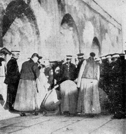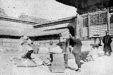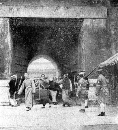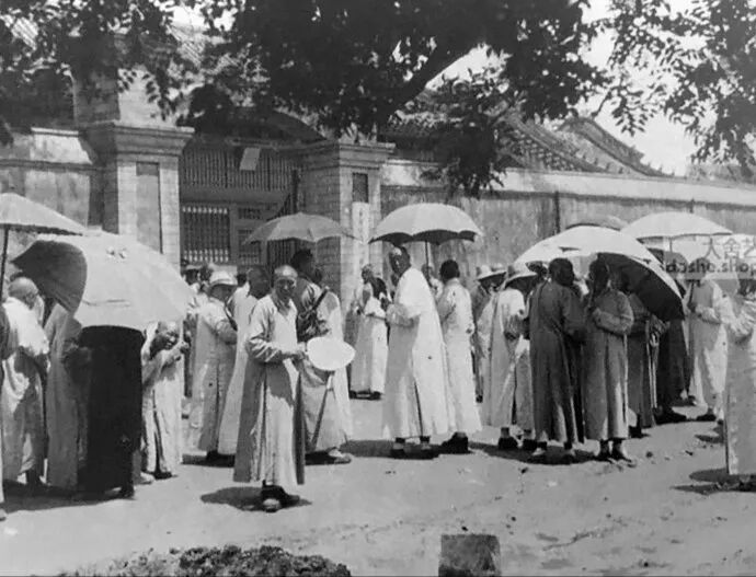 在出宫之前,溥仪发给每个太监大洋10元,每个宫女大洋8元,作为遣散费。当时有太监470多个,宫女100多个,场面一片混乱,哭喊声、咒骂声响成一片。图为要求增加遣散费的太监们在衙门前集会抗议。