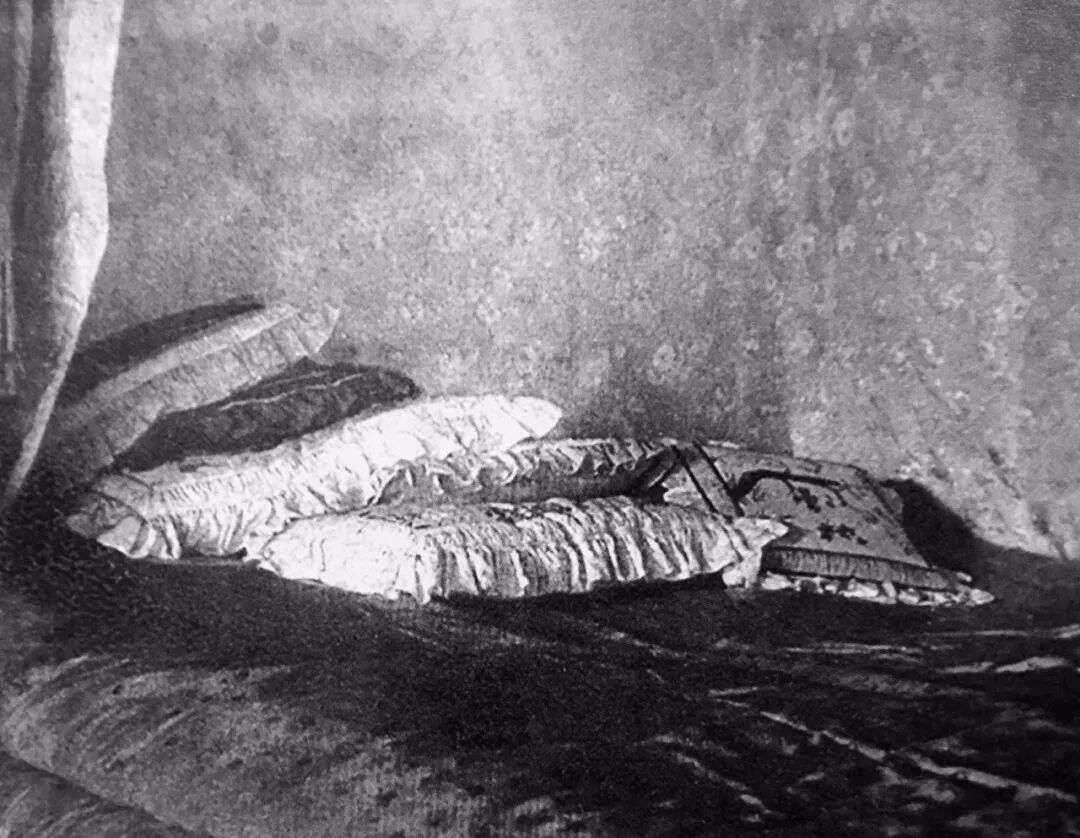 婉容出宫时,储秀宫内婉容卧室床上的未收拾带走的绣花枕头。可以看到储秀宫里的床褥都没有带走。