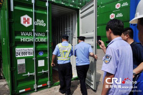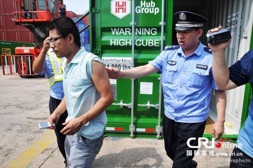 2013年8月9日,山东青岛开发区警务人员打开姜某被困的集装箱门。图片来源:封凯明/中国日报亚洲新闻图片网