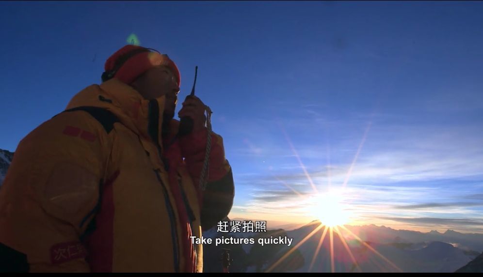 《喜马拉雅天梯》登顶珠峰纪录片中,客户登顶后向导提醒“赶紧拍照,拍完撤退”。