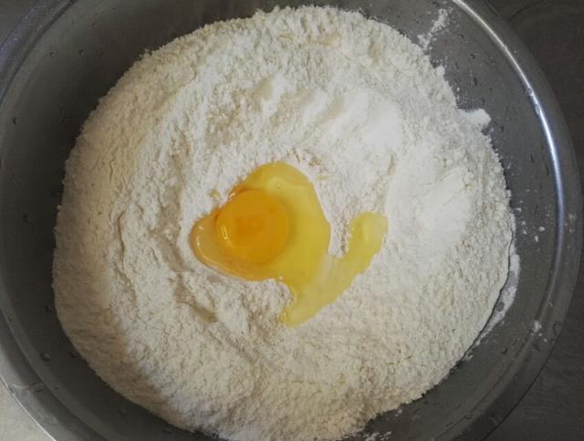 2、把泡打粉和小苏打倒入准备好面粉中,用手搅匀,打入一个鸡蛋,先搅拌均匀。