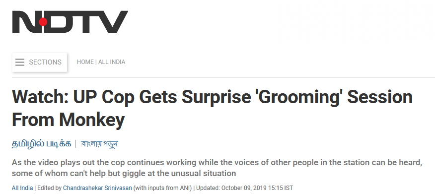 被猴子坐肩头"找虱子",印度一警察仍埋头工作超淡定