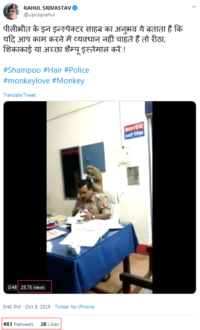 新德里电视台称,当地时间8日,一位名叫拉胡尔·斯里瓦斯塔夫(Rahul Srivastav)高级警官在个人推特分享了这段视频。截止目前,该视频浏览量已经超过2.5万,收到两千多赞。