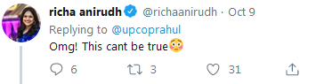 用户@richaanirudh:“天呐!这不可能是真的。”