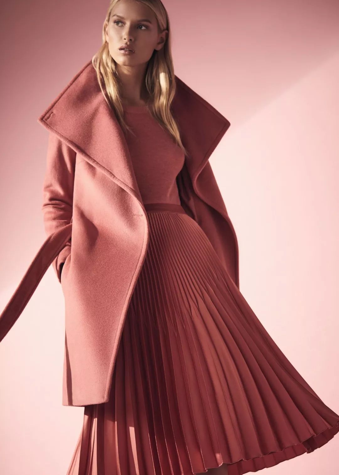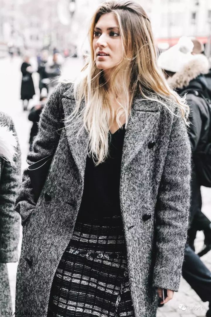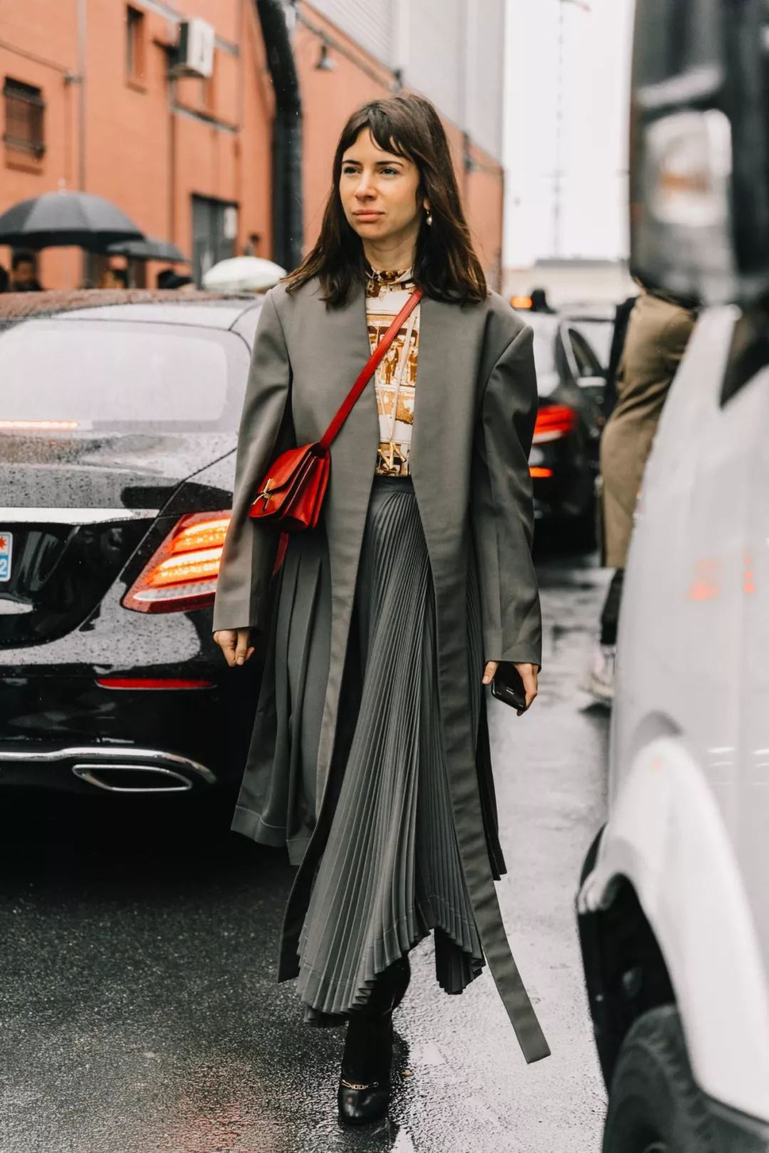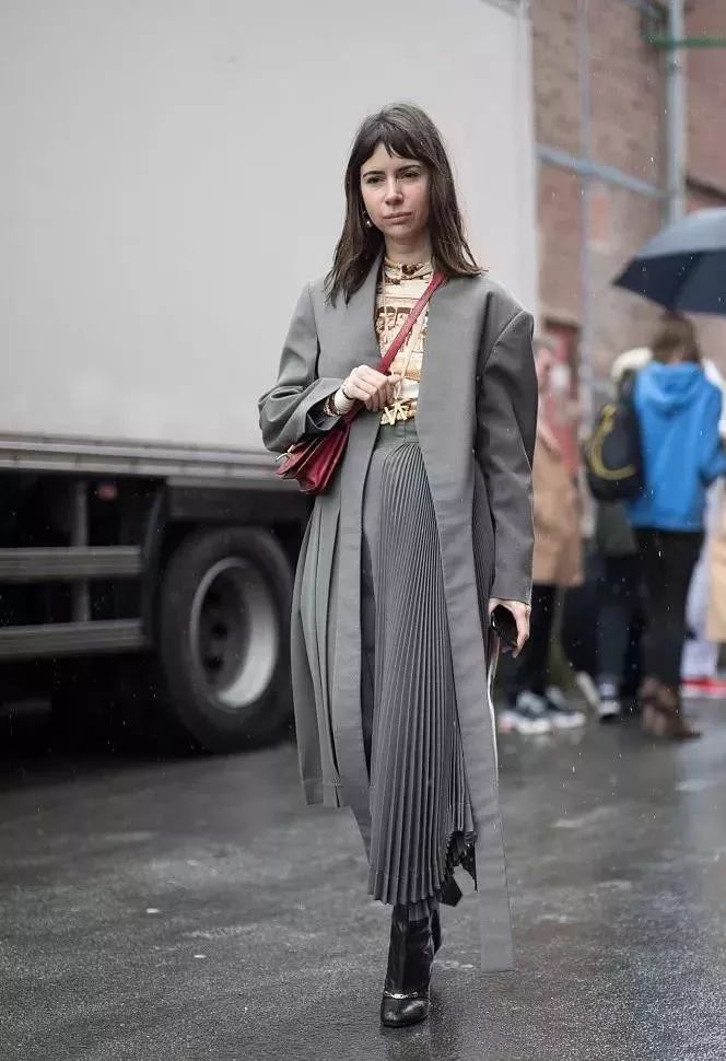 百褶裙尤其适合与大衣玩转同色系搭配,高级显贵又富有层次感。