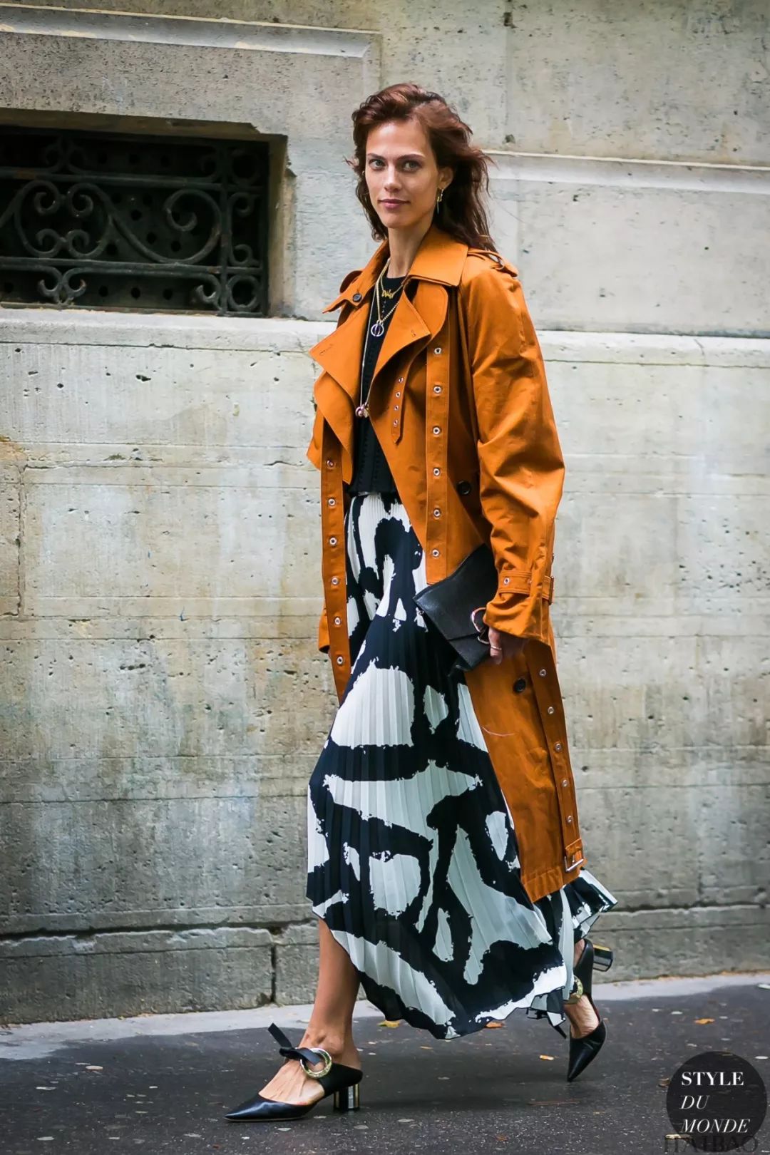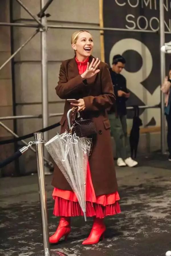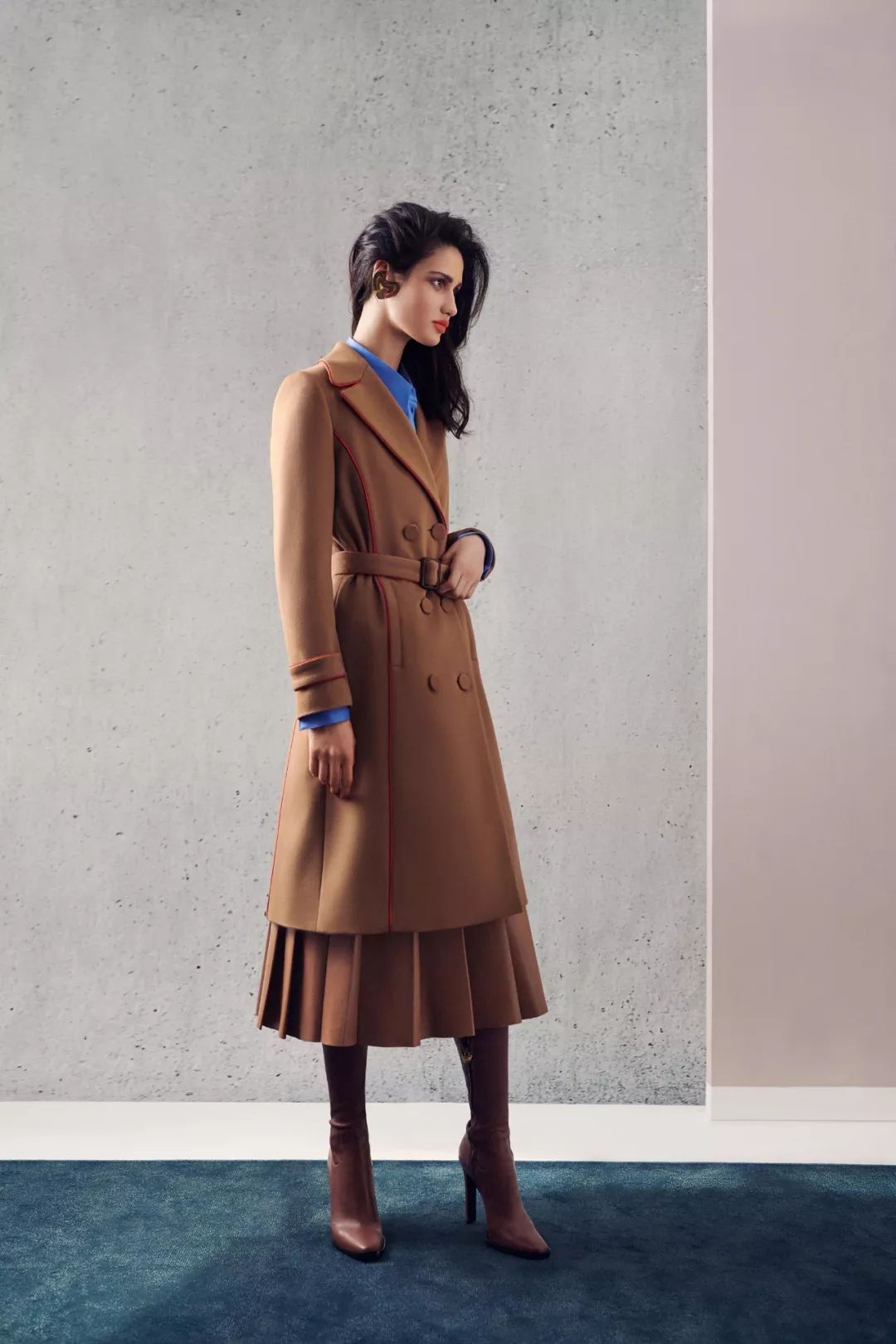 百褶裙尤其适合与大衣玩转同色系搭配,高级显贵又富有层次感。