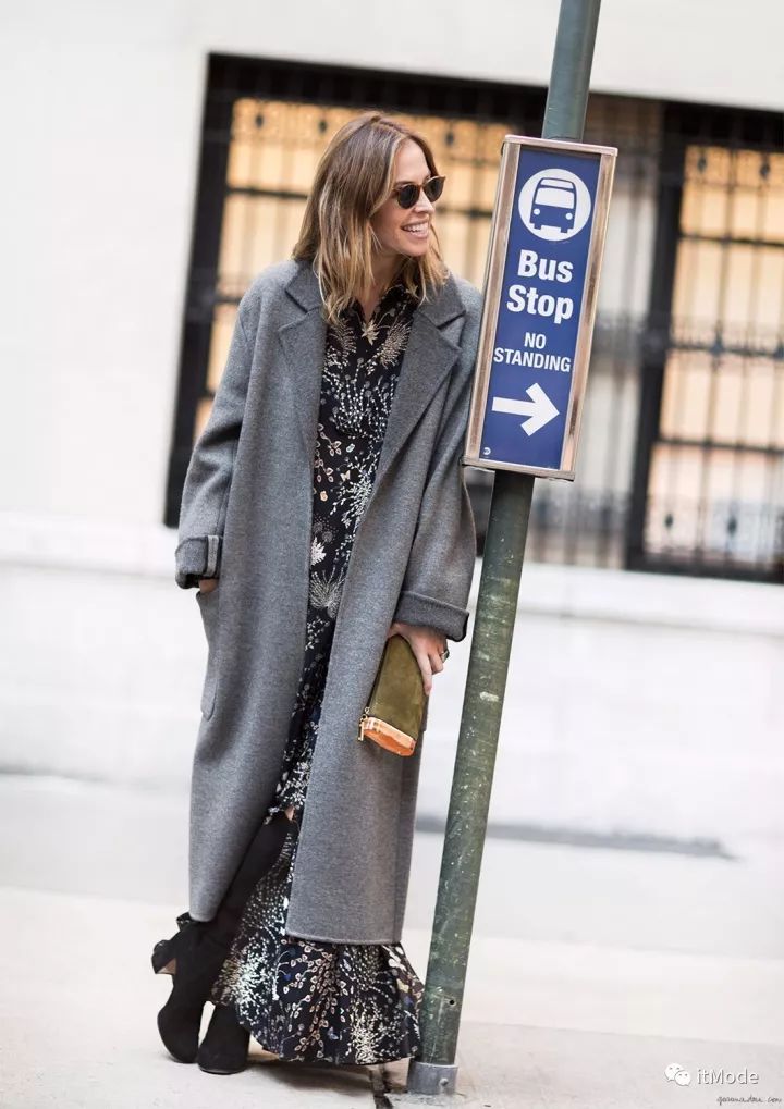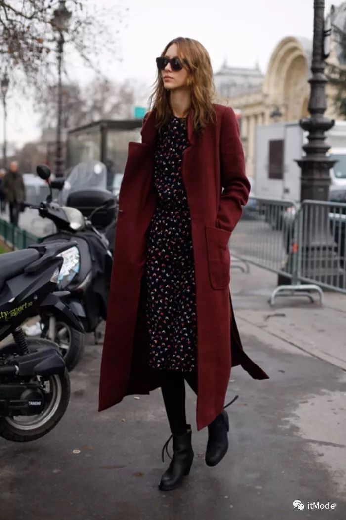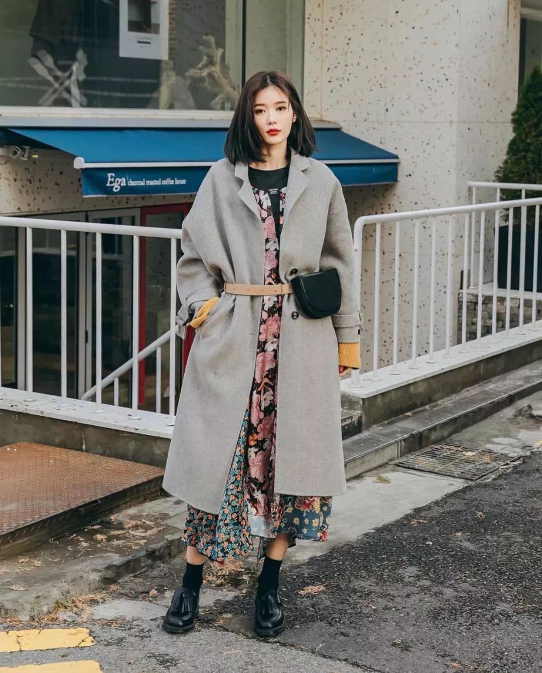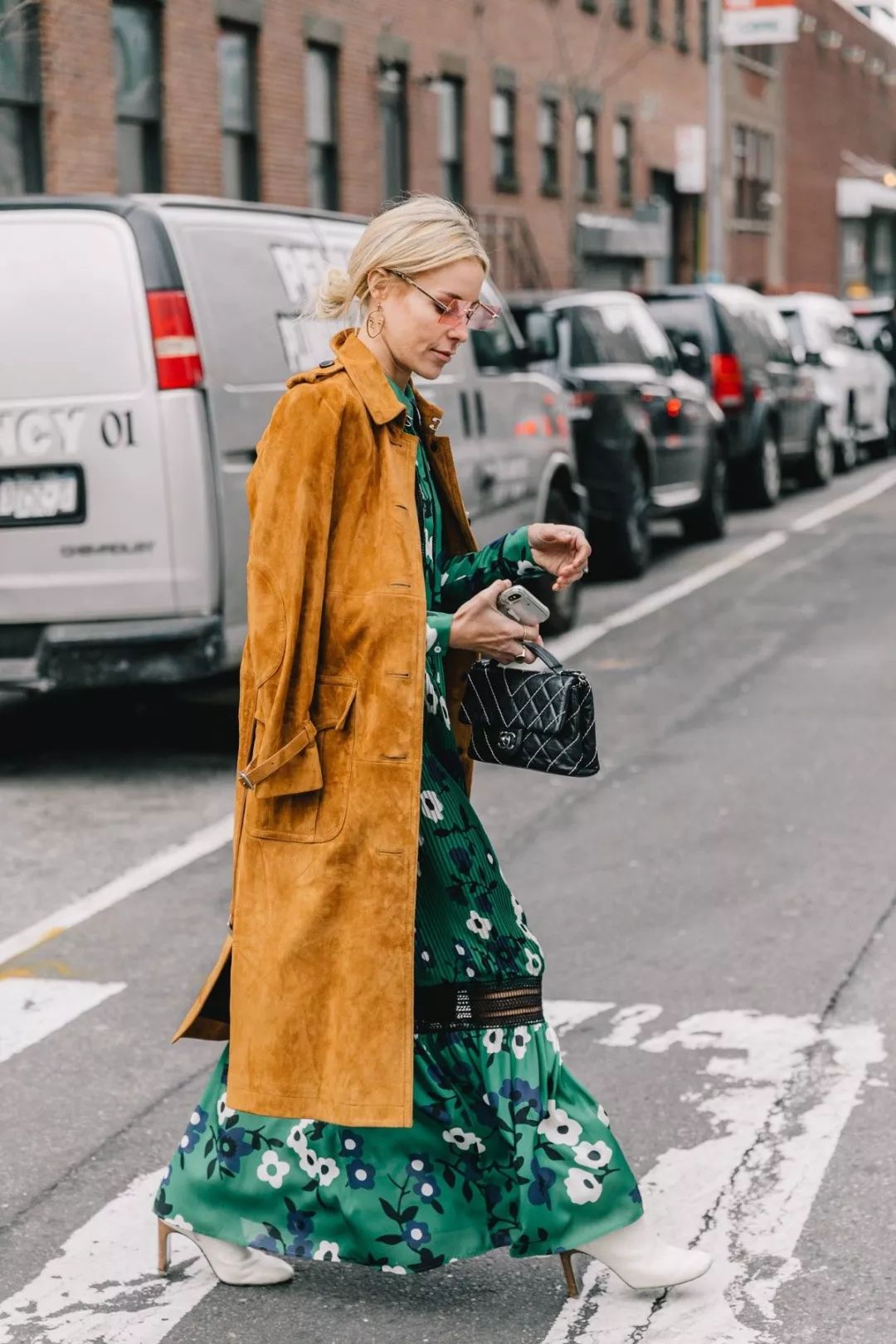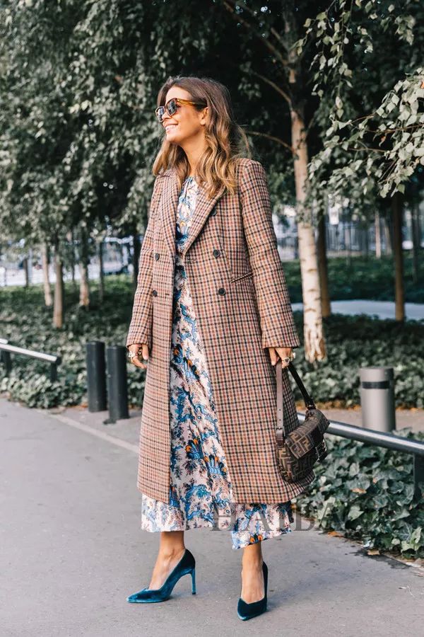 如若觉得大面积的印花连身裙太过繁复瞩目,你也可以直接把大衣系起来穿,只露出一点印花裙的边角就能美出新高度。