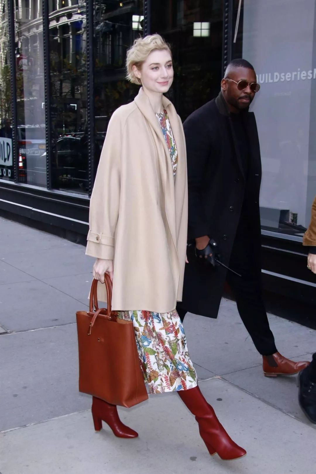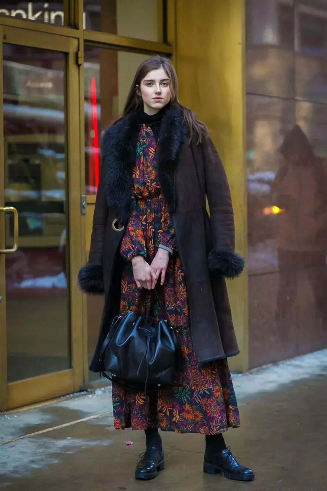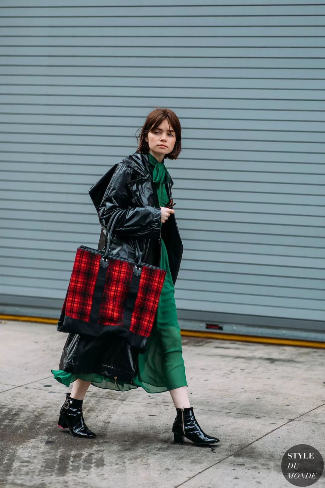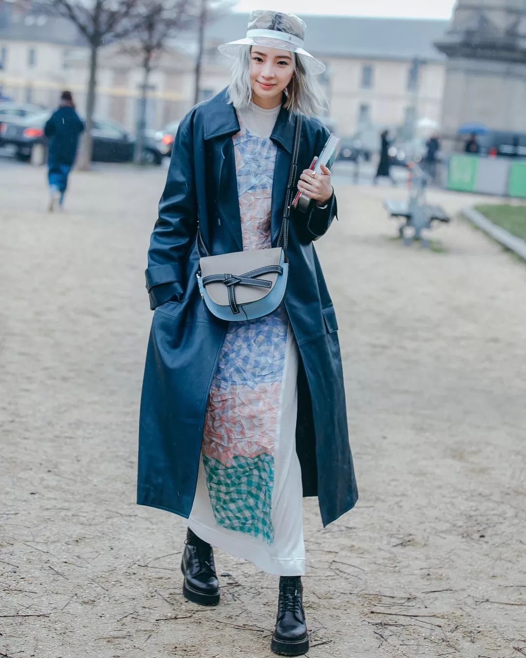 如若觉得大面积的印花连身裙太过繁复瞩目,你也可以直接把大衣系起来穿,只露出一点印花裙的边角就能美出新高度。