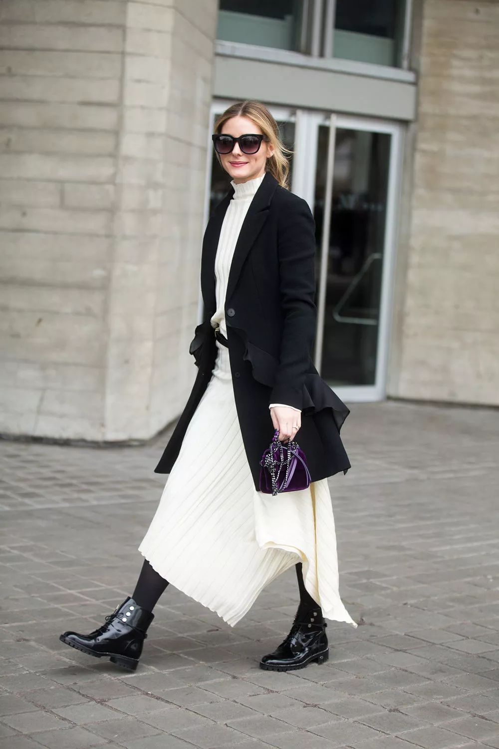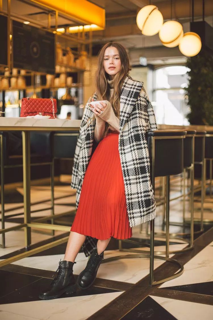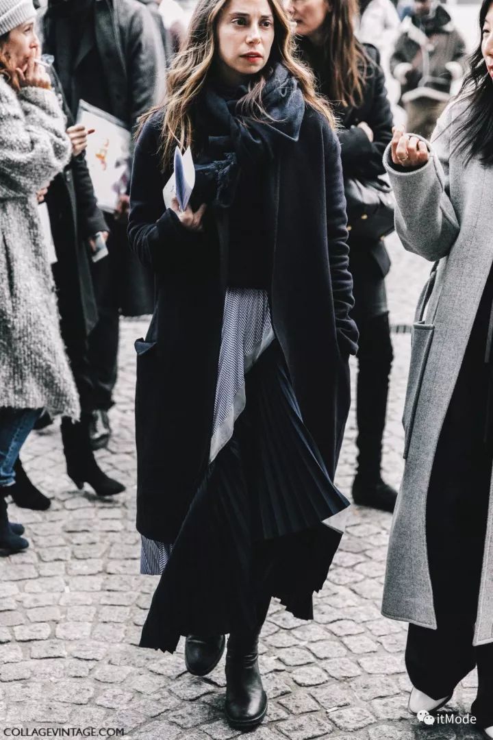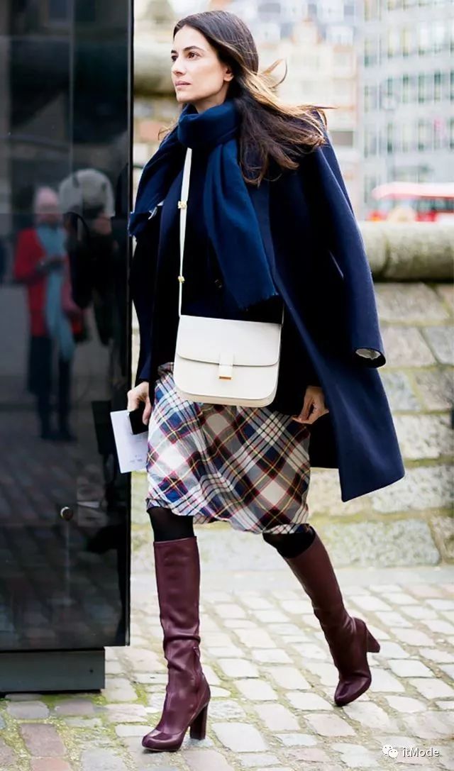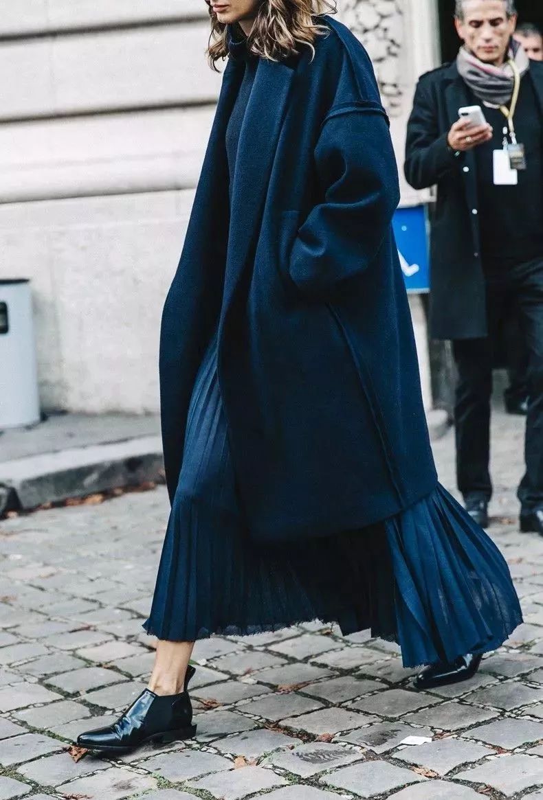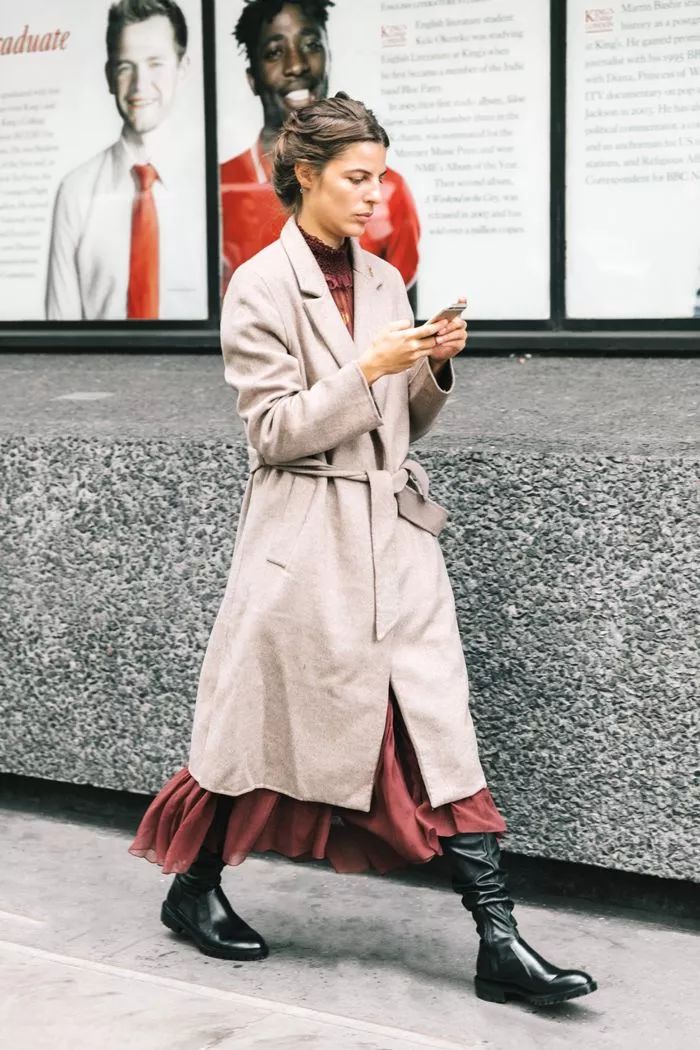 今冬流行用大衣+中长款百褶裙+长靴的搭法,修饰腿型又保暖加倍,好看又实穿。