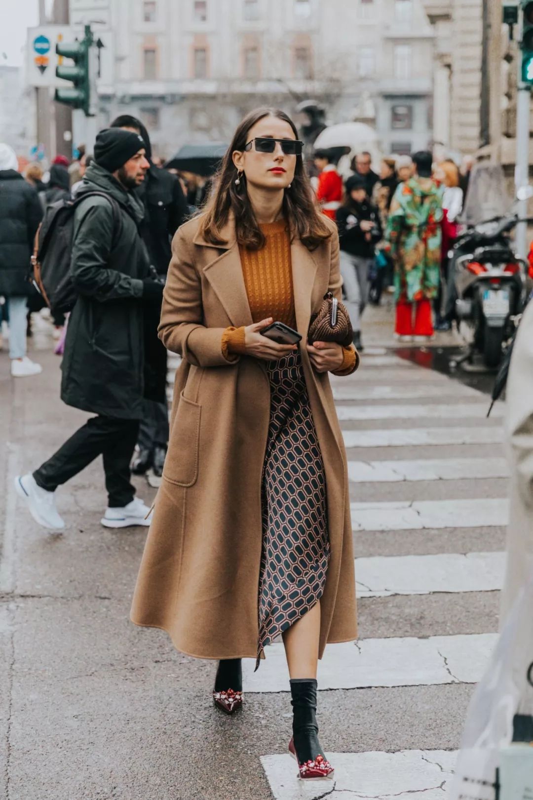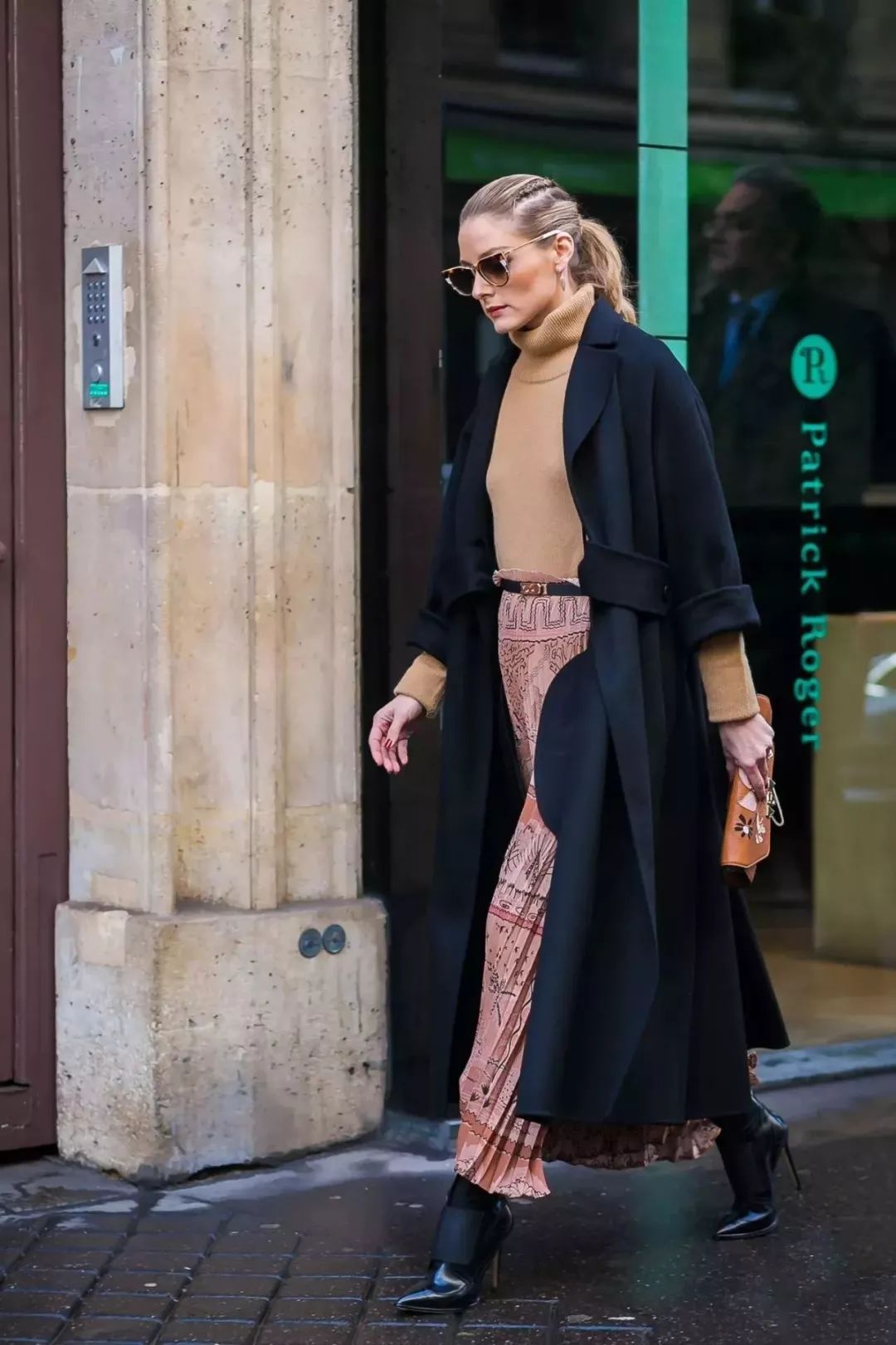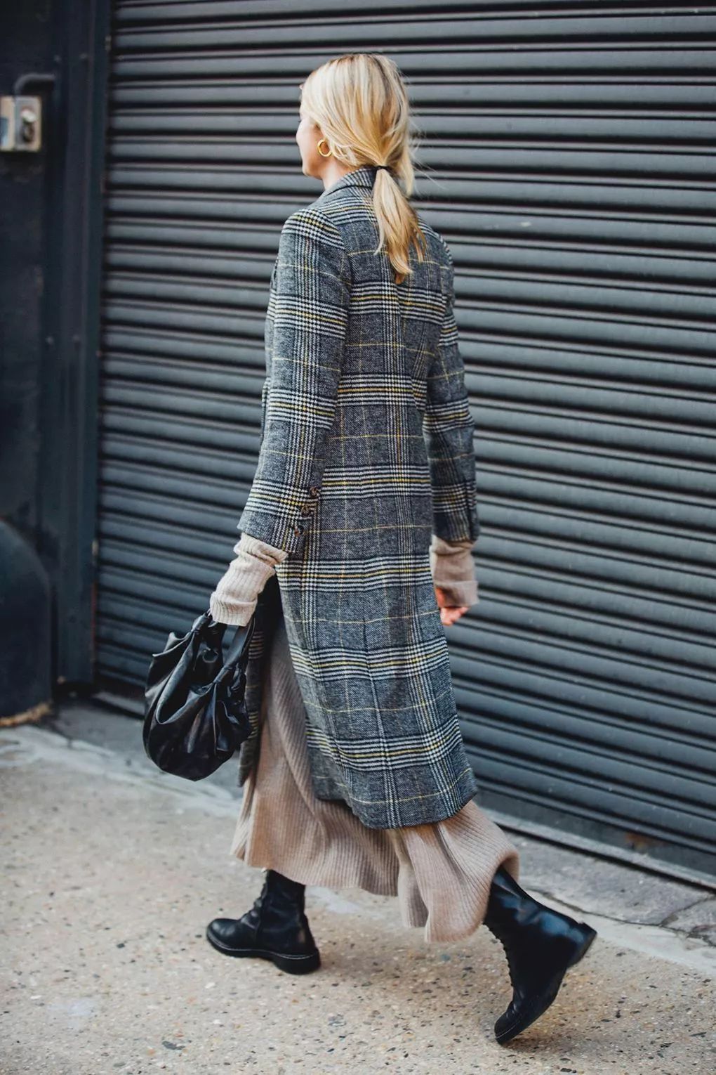 今冬流行用大衣+中长款百褶裙+长靴的搭法,修饰腿型又保暖加倍,好看又实穿。