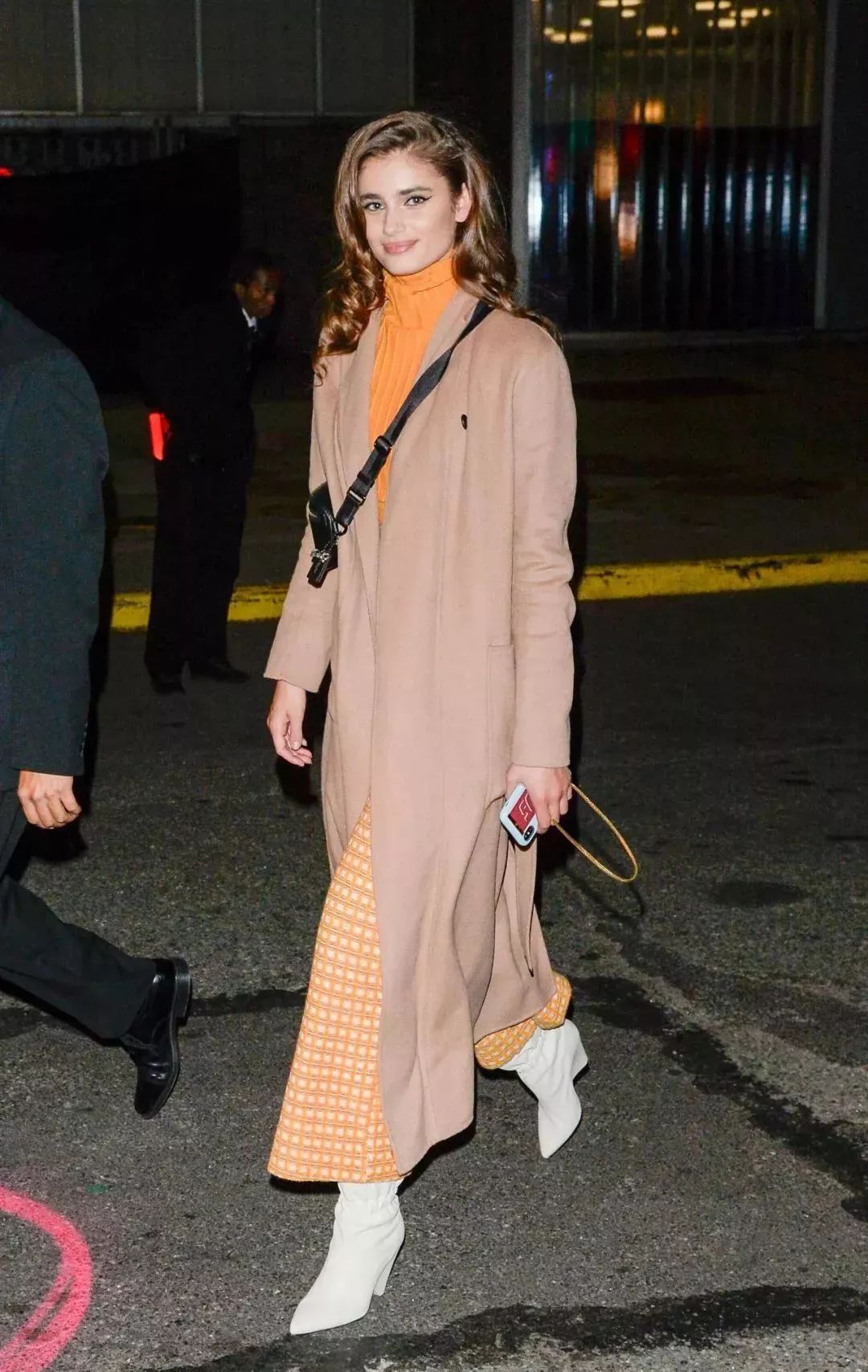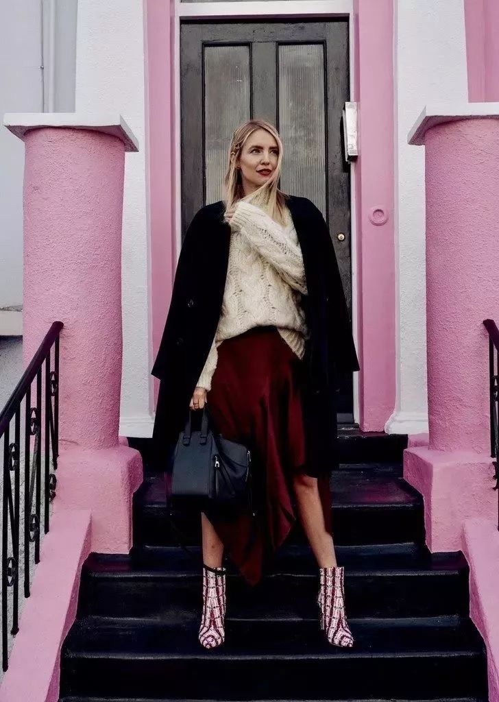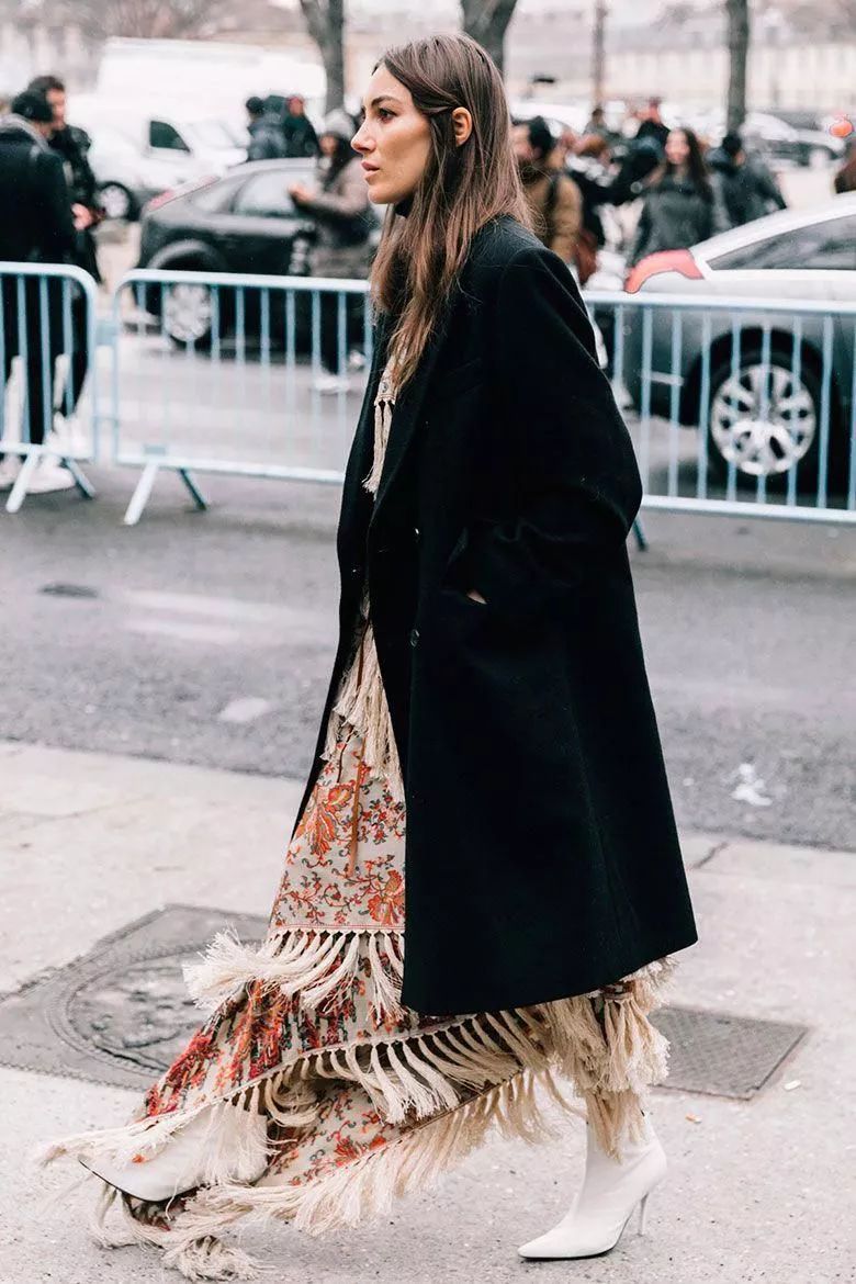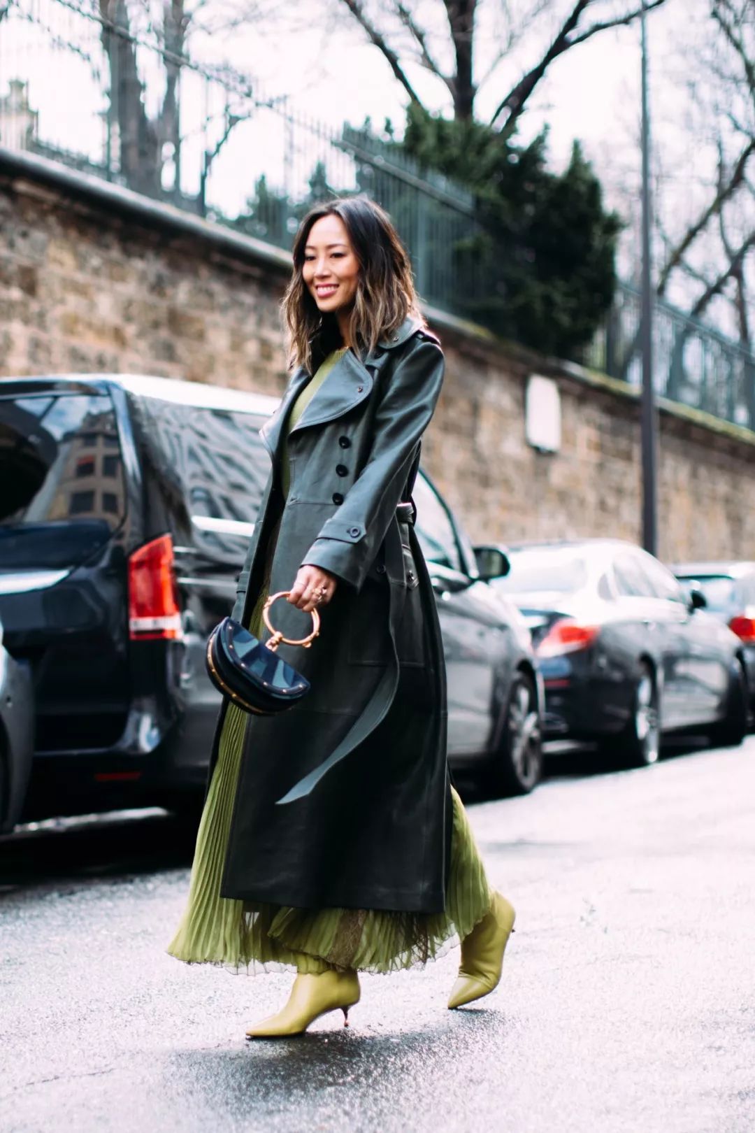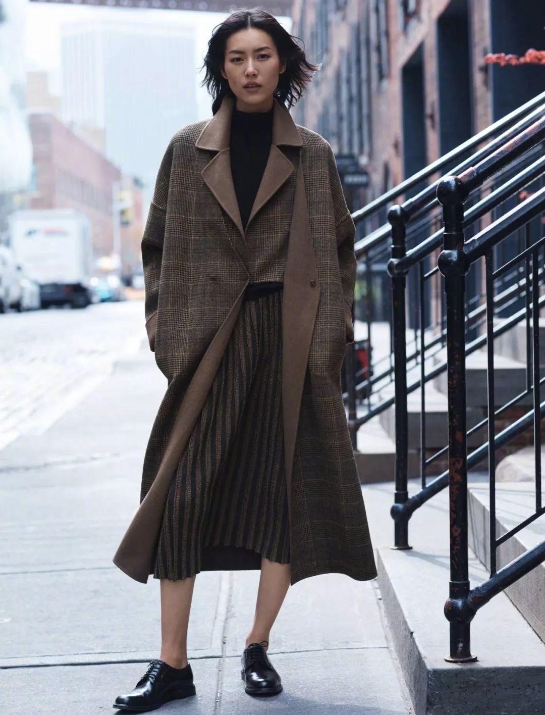 今冬流行用大衣+中长款百褶裙+长靴的搭法,修饰腿型又保暖加倍,好看又实穿。