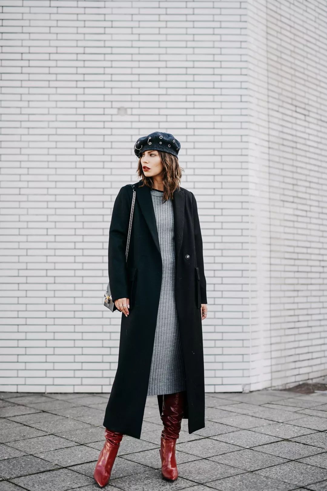 你可以用短款的针织裙作为大衣的内搭,再搭配一双过膝长靴+连裤袜,便能穿出扑面而来的性感女人味。