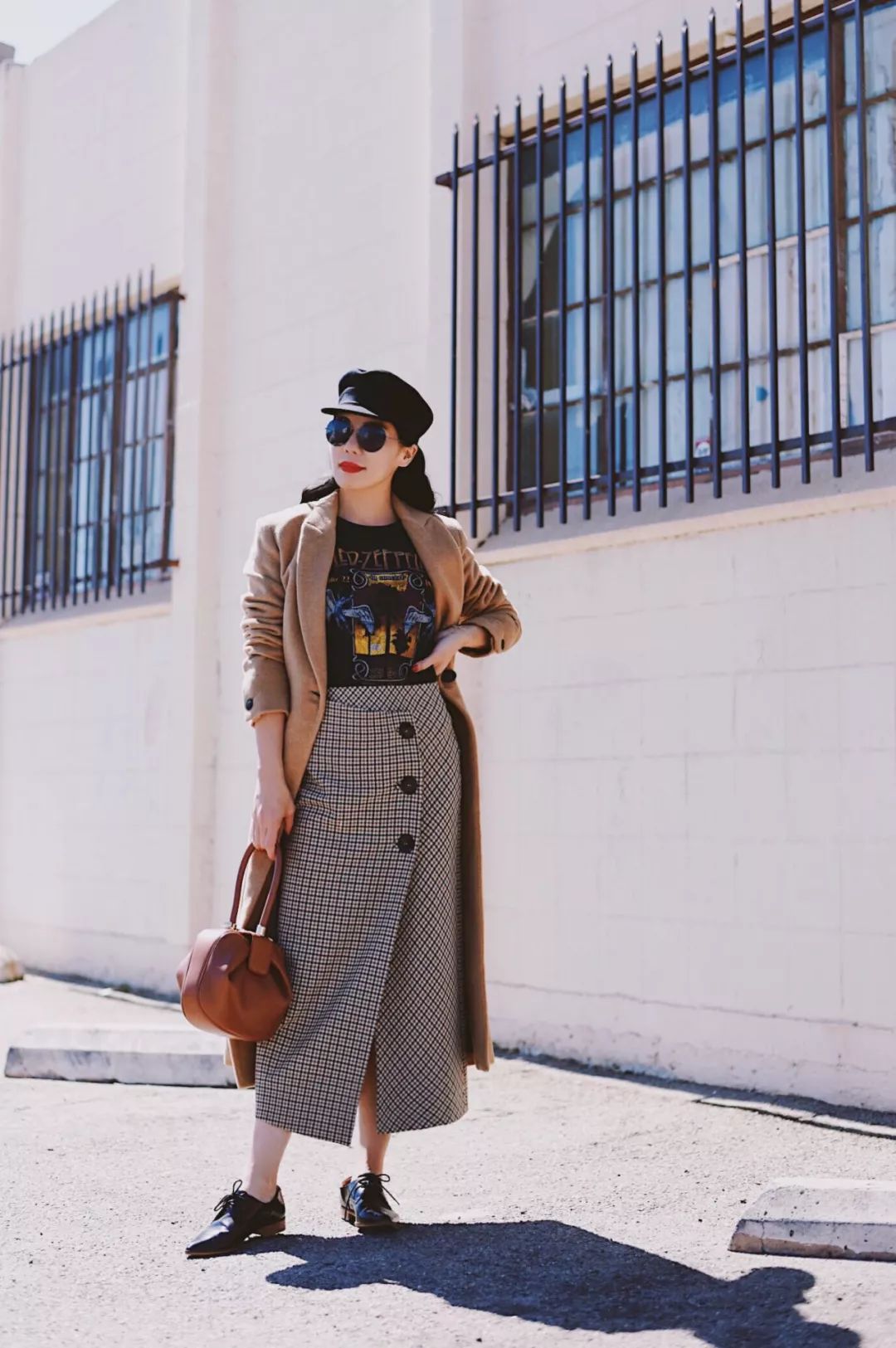 深色的格纹半裙与冬季最相配,不仅百搭所有大衣,无论是搭配肉色or黑色打底裤都毫不违和,推荐各位入手。