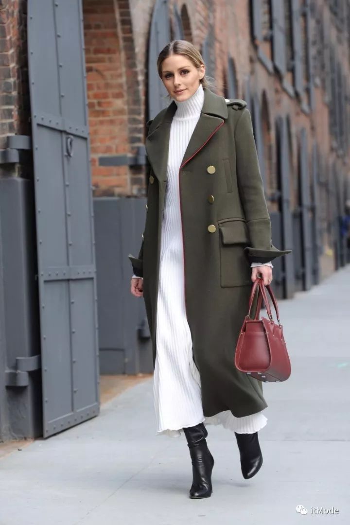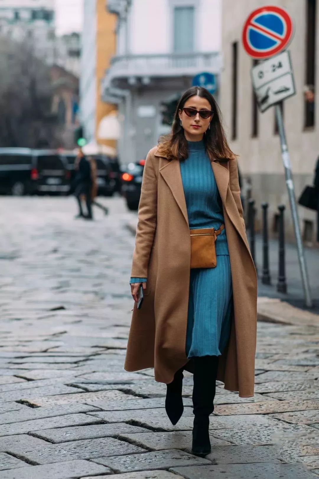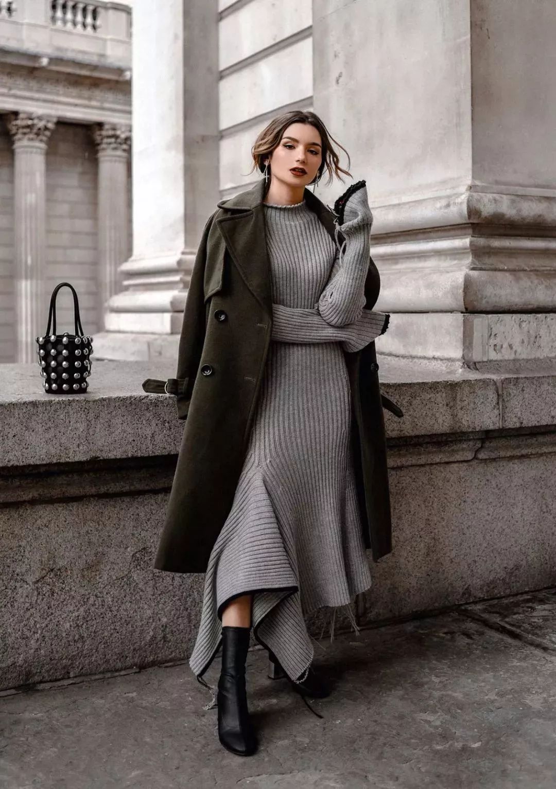 你也可以选择颜色更亮丽的针织裙款作为你的大衣内搭,人群中更能轻松出挑。