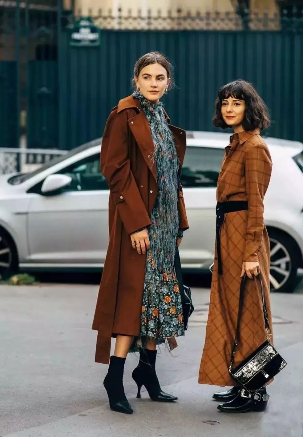 深色系的印花裙最是大气百搭,既能让基础款的素色大衣时髦升级