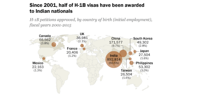 这样,美国的科技公司能以更低的雇佣成本获得技术开发人员,同时大量印度裔工程师也就拿到更多的赴美工作并居留的机会。这也是H-1B中印度裔人占比那么高的原因之一。
