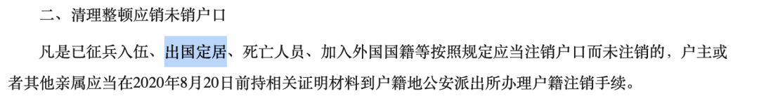 凡是已征兵入伍、出国定居、死亡人员、加入外国国籍等按照规定应当注销户口而未注销的,户主或者其他亲属应当在2020年8月20日前持相关证明材料到户籍地公安派出所办理户籍注销手续。