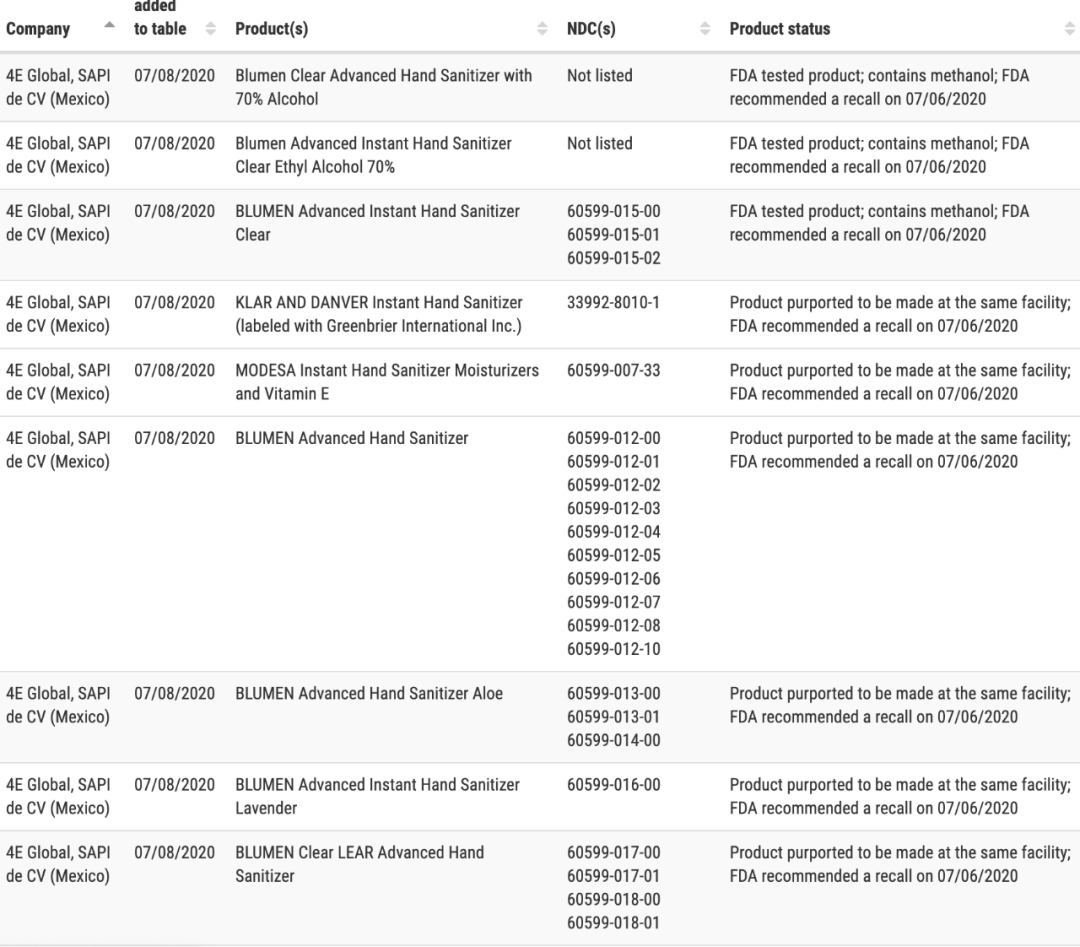 FDA上周表示,已经有成年人和儿童使用了由甲醇制成的洗手液的案例。 如果家里的酒精洗手消毒液在名单内,为避免中毒风险,建议小伙伴们不要继续使用,可以扔掉或者去店里退货。
