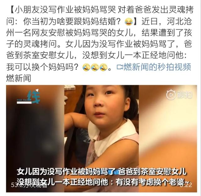 网上有个视频火了,小女孩因为没写完作业被妈妈骂哭,流着泪问爸爸:你当初为啥要跟妈妈结婚?同样也问了,能不能换个妈妈?