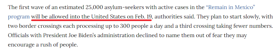 当局表示,墨西哥估计有2.5万名正在申请保护的难民,其中第一批将于2月19日获准进入美国。