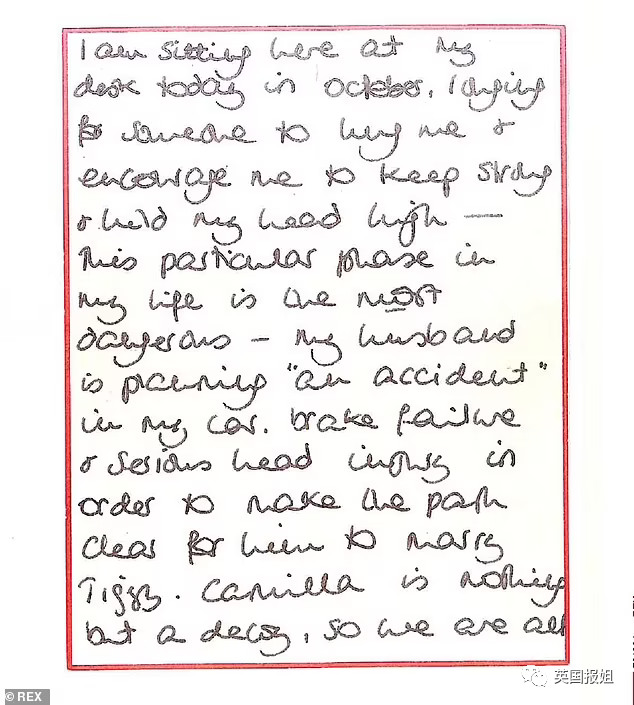字条中提出了一个令人警方头疼的说法。戴安娜认为,当时与她分居但尚未离婚的查尔斯打算故意制造车祸,从而重伤或杀死她,然后他就可以和Tiggy结婚。
