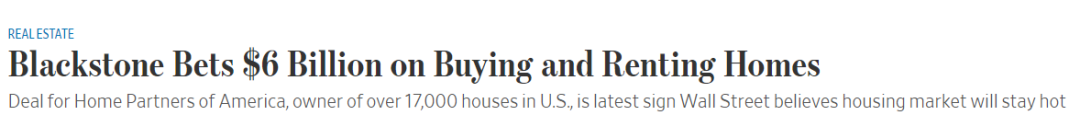 黑石集团十分看好美国住房市场,和其他华尔街强势企业一样,他们纷纷收购单户出租公司。加拿大房地产巨头布鲁克菲尔德资产管理公司(Brookfield Asset Management Inc.)最近收购了一家拥有超过10,000套美国住房的房东的股份。摩根资产管理公司(J.P. Morgan Asset Management)和Rockpoint Group LLC也对单户租赁运营商进行了大量投资。该业务对投资者有吸引力,这是由于房价上涨和租金上涨可以为投资者带来收益。
