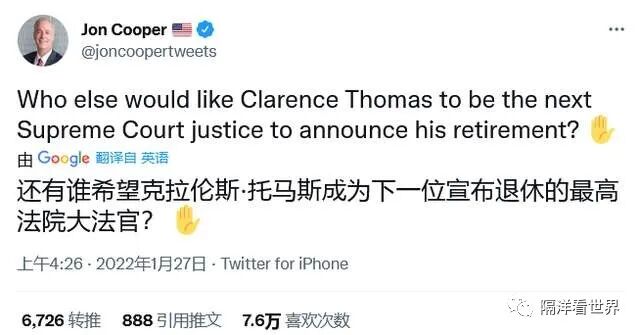 北京时间1月27日,他发推称,希望托马斯大法官也宣布退休。结果7.6万人点赞!转发次数达到6726。