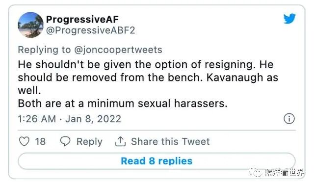 还有一个人打趣说,“他不应该被赋予辞职的选择权。他应该被从法官席位上撤下。卡瓦诺也是如此。两人至少都是性骚扰者。”