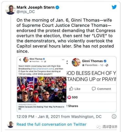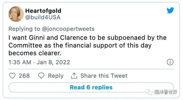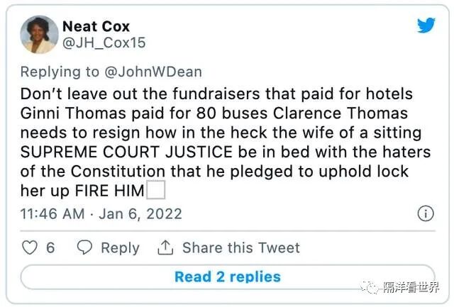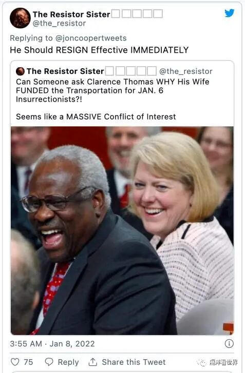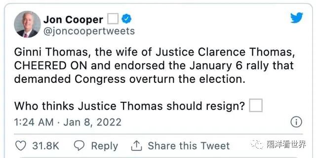 有个叫乔恩·库珀(Jon Cooper)的人在推特上写道:"克拉伦斯·托马斯大法官的妻子金妮·托马斯欢呼并支持1月6日要求国会推翻选举的集会。谁认为托马斯大法官应该辞职?"