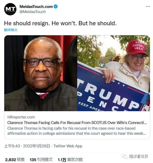 被妻子害惨?推特上刮起要美国大法官托马斯辞职风暴