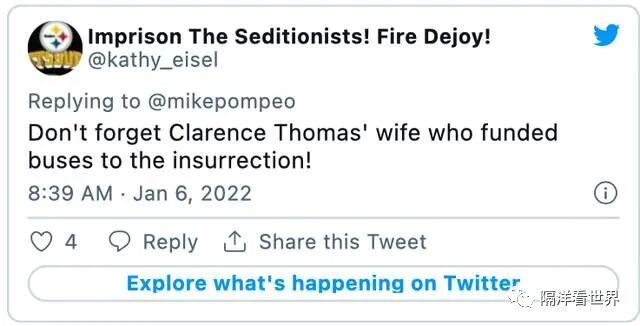 第三位评论说:"不要忘记克拉伦斯·托马斯的妻子,她资助了前往叛乱的巴士!"