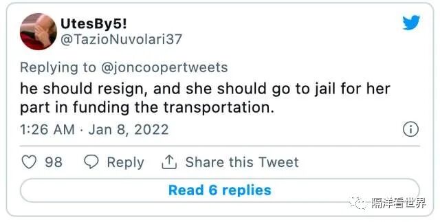 在推特上很有影响力的、一个名为MeidasTouch.com的用户转发了一则报道(上面有提到)时称,托马斯应该辞职。时间是北京时间1月29日9时43分。