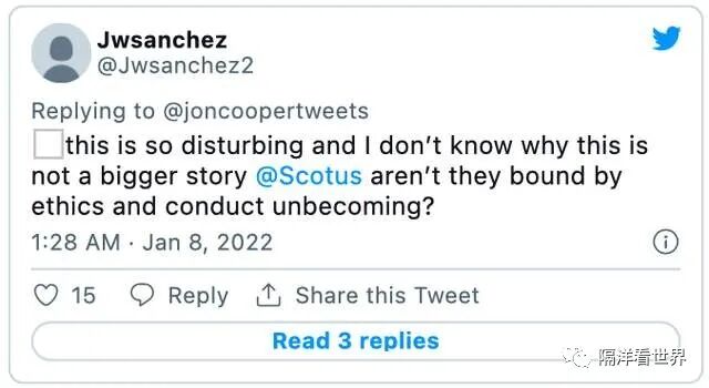 另一位评论者在推特上写道:"这太令人不安了,我不知道为什么这不是一个更大的故事,@Scotus他们不是受到道德和行为的约束吗?”