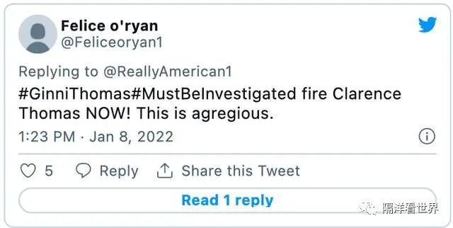 有人这样写道:"一定要对金妮·托马斯展开调查!现在就解雇托马斯!这是令人震惊的。"