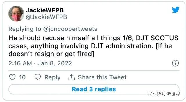 还有一位评论说:“他应该回避所有和1/6以及特朗普(有关的送到)最高法院案件,任何涉及特朗普政府的事情,[如果他不辞职或被解雇]"。
