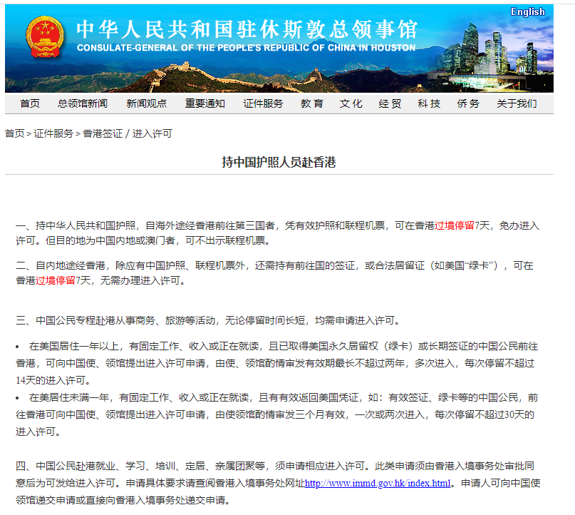 领事馆显示:“5月1日起,持中国护照,自海外途经香港前往第三国者,凭有效护照和联程机票,可在香港过境停留7天,免办进入许可。但目的地为中国内地或澳门者,可不出示联程机票。”