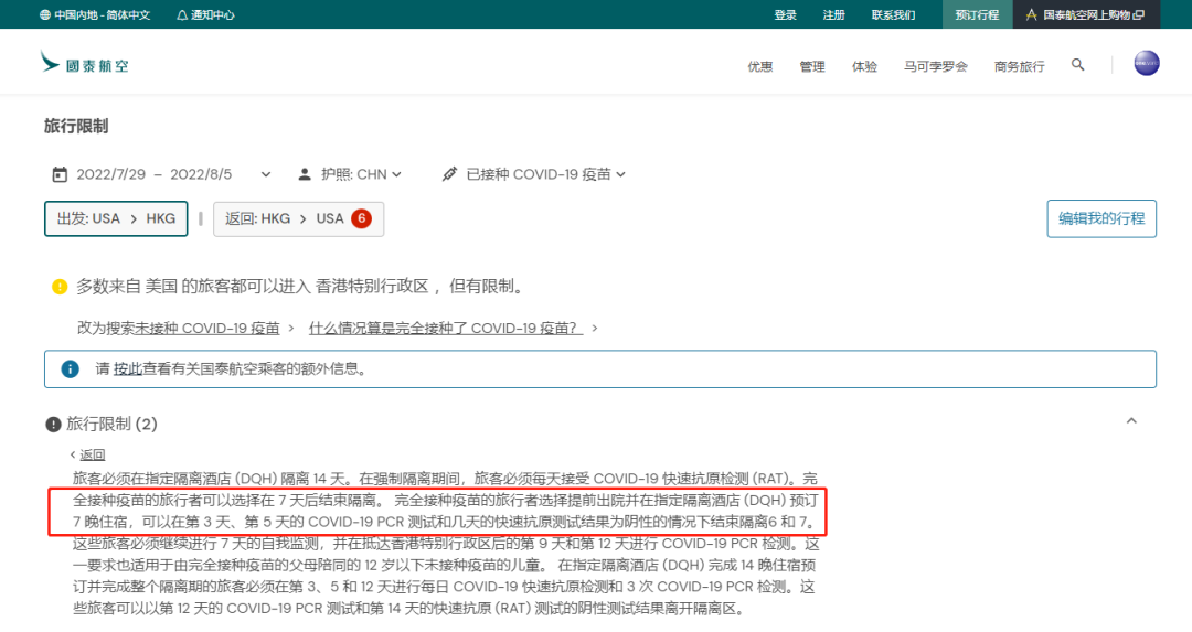 同时,根据国泰航空官网显示:“旅客必须在指定隔离酒店 (DQH) 隔离 14 天。在强制隔离期间,旅客必须每天接受 COVID-19 快速抗原检测 (RAT)。完全接种疫苗的旅行者可以选择在 7 天后结束隔离。完全接种疫苗的旅行者选择提前出院并在指定隔离酒店 (DQH) 预订 7 晚住宿,可以在第 3 天、第 5 天的 COVID-19 PCR 测试和几天的快速抗原测试结果为阴性的情况下结束隔离6 和 7。”