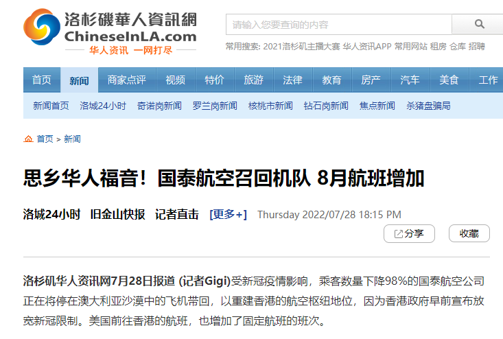 近期,洛杉矶飞中国仍有多航班受熔断2周。国泰航空美国飞香港的航班传来好消息,8月航班有所增加。