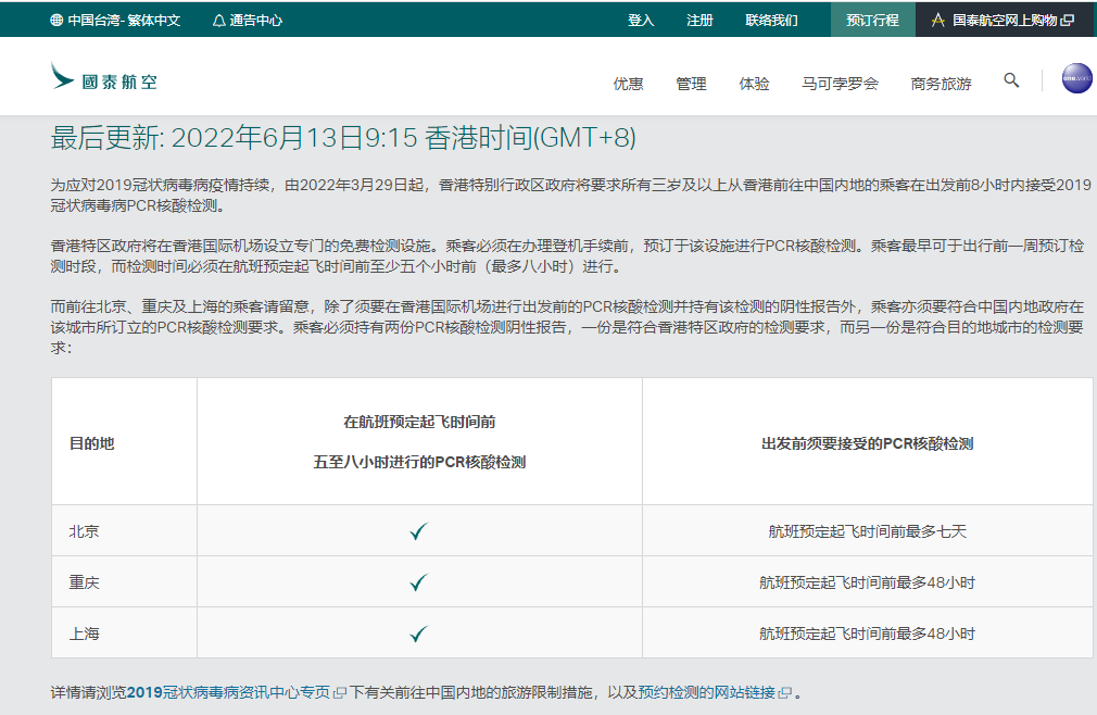 而前往北京、重庆及上海的乘客请留意,除了须要在香港国际机场进行出发前的PCR核酸检测并持有该检测的阴性报告外,乘客亦须要符合中国内地政府在该城市所订立的PCR核酸检测要求。乘客必须持有两份PCR核酸检测阴性报告,一份是符合香港特区政府的检测要求,而另一份是符合目的地城市的检测要求。”