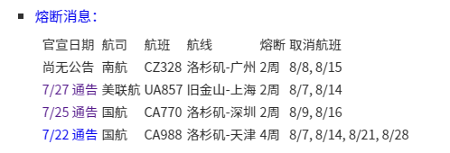 而早前7月22日本网也报道过:国航CA988航班(洛杉矶至天津)自8月8日起,继续暂停该航班运行4班,此前CA988已停运2班。