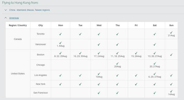 2022年8月,由纽约飞香港,已恢复到每天有固定航班。由旧金山飞往香港的固定航班是每周三、四、六,加上8月14日(周六)的航班。波士顿前往香港的航班定于8月22、29日(周一),16、23、30日(周二),17、24日(周三),11、18、25日(周四),19、26日(周五),13、20、27日(周日) 。芝加哥前往香港的航班为8月25日(周四)、8月20和27日(周六)。