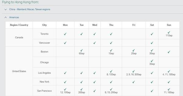 2022年9月,由纽约飞香港,维持每天有固定航班。由旧金山飞往香港的固定航班是每周三、六,加上9月12、19日(周一)航班,9月20日(周二),9月8、15、29日(周四),9月11、18日(周六)。波士顿前往香港的航班的固定出发时间是周日,加上9月6日日(周二),9月1日(周四),9月2日(周五),9月3日(周六) 。芝加哥前往香港的航班目前已定下的出发时间是9月3日。