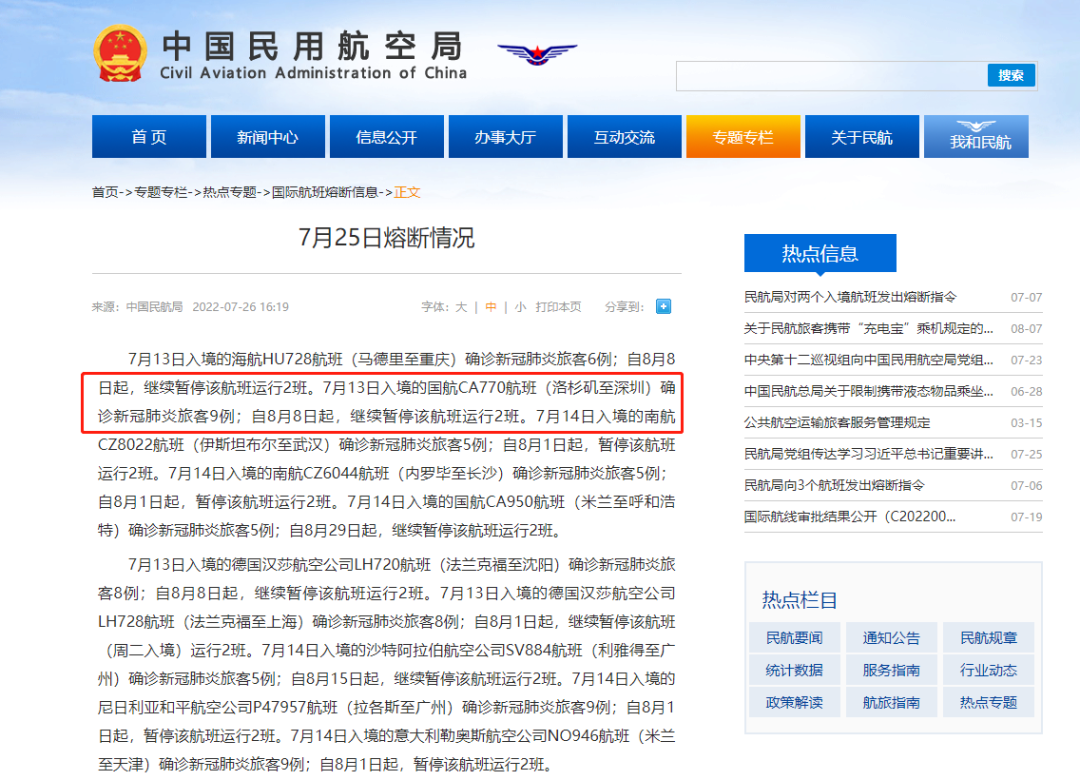 根据情况表示:“7月13日入境的国航CA770航班(洛杉矶至深圳)自8月8日起,继续暂停该航班运行2班。”