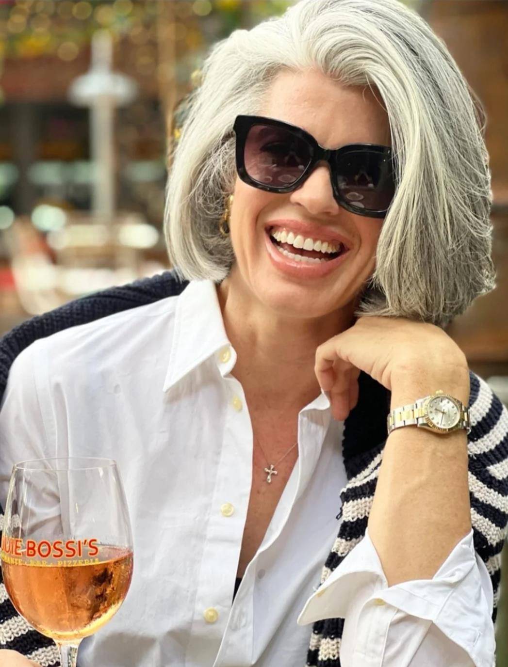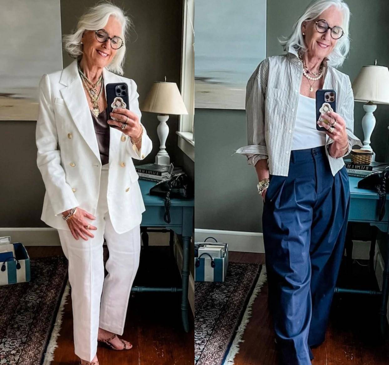 她,干练利落的短发,一头银发是她的标志,配上大女人风的穿搭,你完全看不出她的年龄。廓形的西装并不只属于年轻精英们,60岁的老太太穿上也够范儿。
