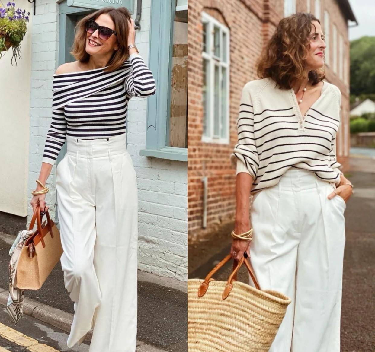 简单的黑白条纹,可以露出一侧的香肩,感觉特别有女人味,有些小小的性感,搭配白色阔腿裤,做到了宽窄平衡,看起来端庄大方,又很有味道,非常适合度假或朋友聚会。