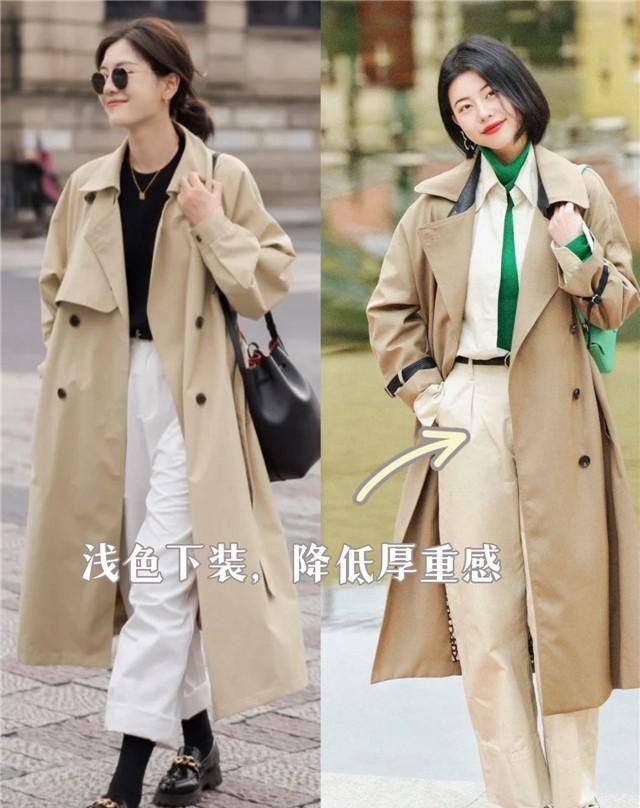穿卡其色风衣,需要学会降低搭配的厚重感,选择浅色的下装去中和卡其色的暗沉感也不错,比如姐妹们可以搭配白色的裤子,白色的下装和卡其色构成了色彩的反差感,还借助这种时髦的浅色体现出搭配的靓丽感,显得很清爽,春夏季节穿太出彩啦!