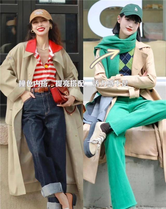 比如彩色的内搭,彩色的配饰点缀,和基础的卡其色形成很明显的对比,毫不费力地打破了卡其色的风格单调感,为你的穿搭增加更多的时髦小心机哦。