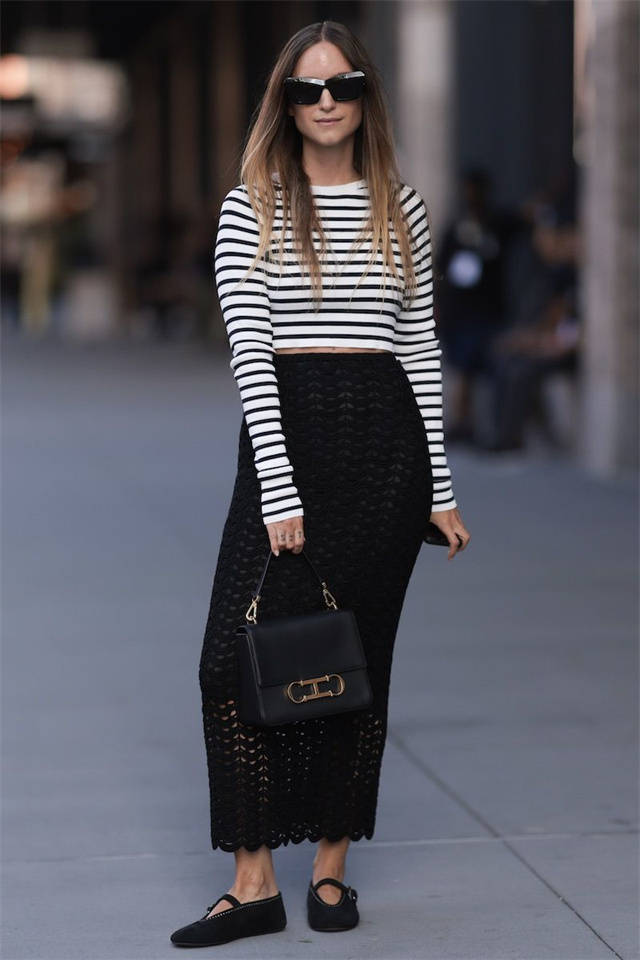 即使是横条衫x钩针裙,也不会看起来杂乱,这是因为黑色的选择能够使线条更清晰,而且黑色是一种经典的颜色,永远不会过时。