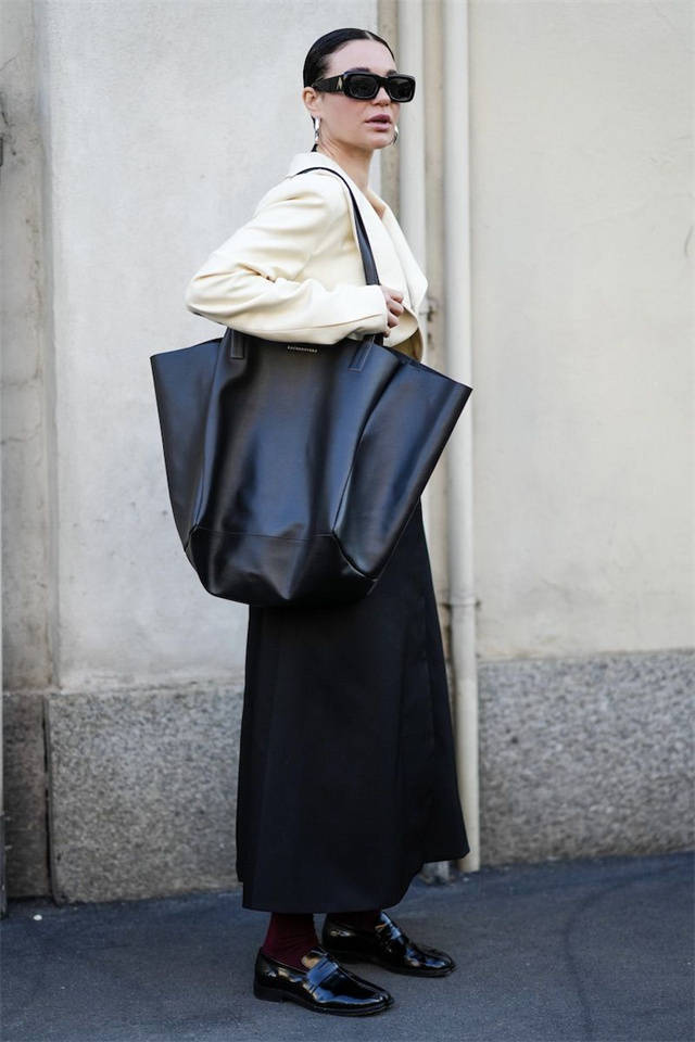 黑白相间的穿搭,能够营造出光泽感十足的效果,同时又不会显得单调。搭配喇叭缎裙、漆皮鞋和皮包,给人一种柔顺的感觉。