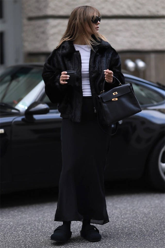 搭配一条黑色的工字长裙,这样能够为身上的皮草夹克,提供一个理想的风格,展现出优雅和时尚感。